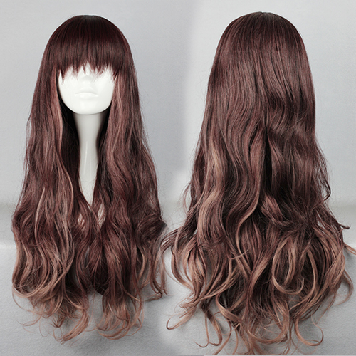 75cm Long Curly Brown Ombre Wig Long Wavy Heat Resistant Synthetic Hair with bangs Cosplay Wigs