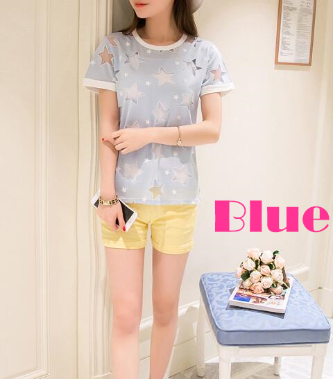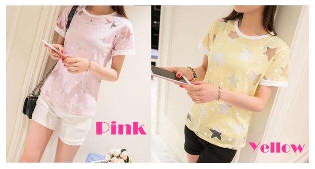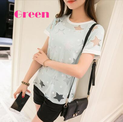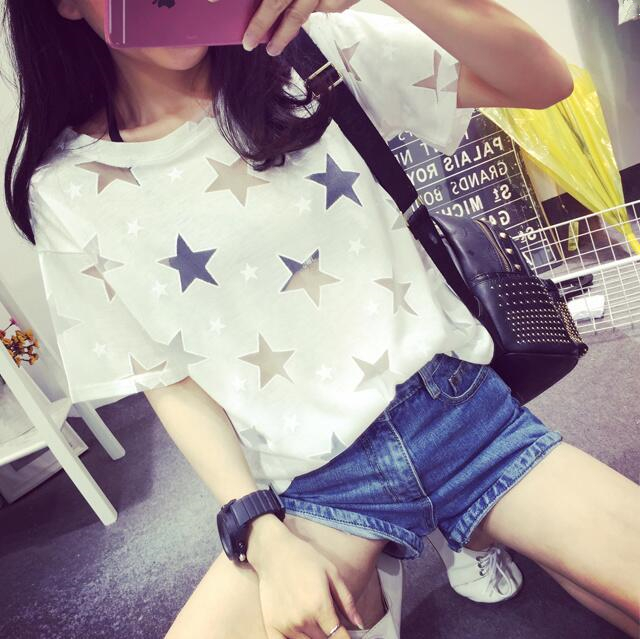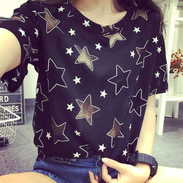 Harajuku Hollow Five-pointed Star Satellite Network Yarn Stitching Loose Short-sleeved T-shirts