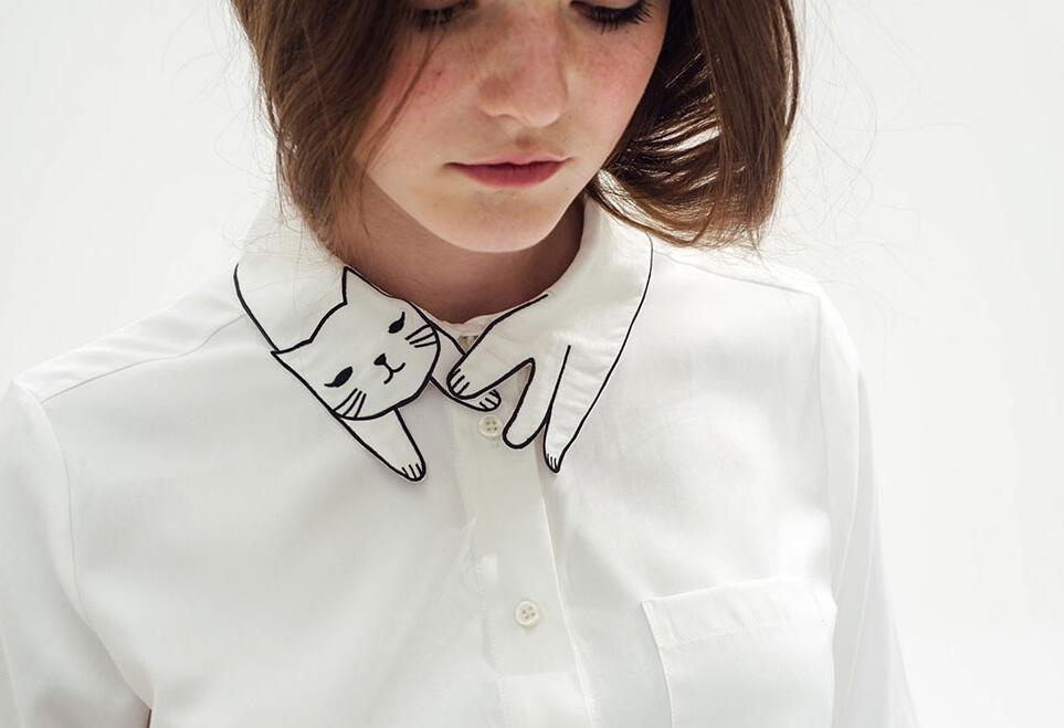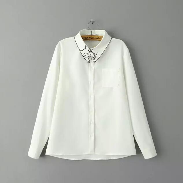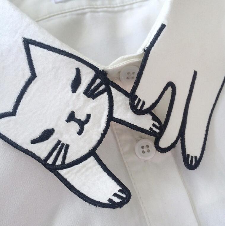 Cute Kitty Cat embroidered Collar Long Sleeved Shirt