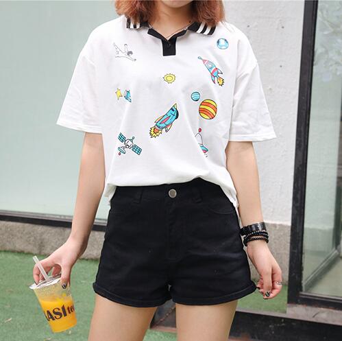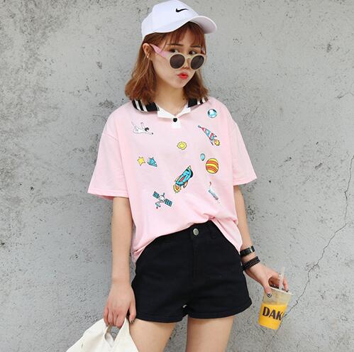 Harajuku Rocket Planet Embroidered Polo T-shirt