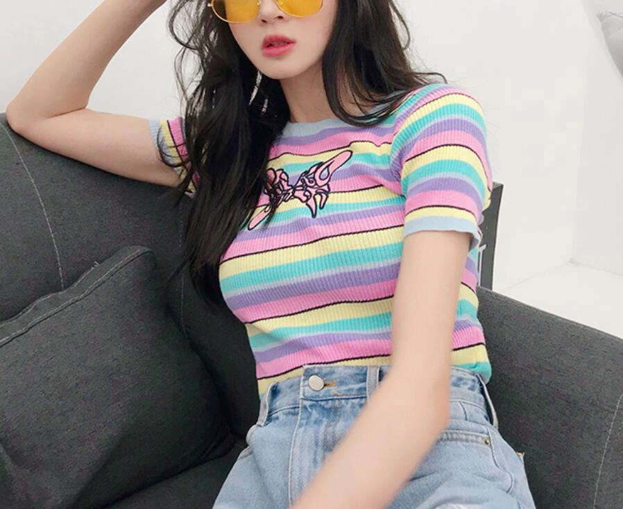 Sweet Bowknot Embroidery Rainbow Stripe Knitted Top