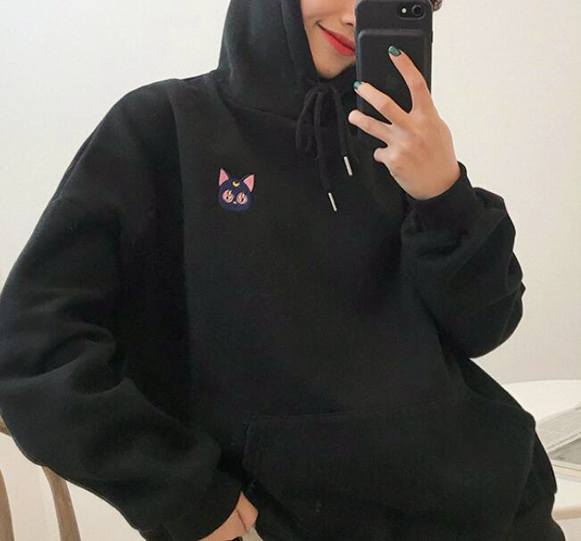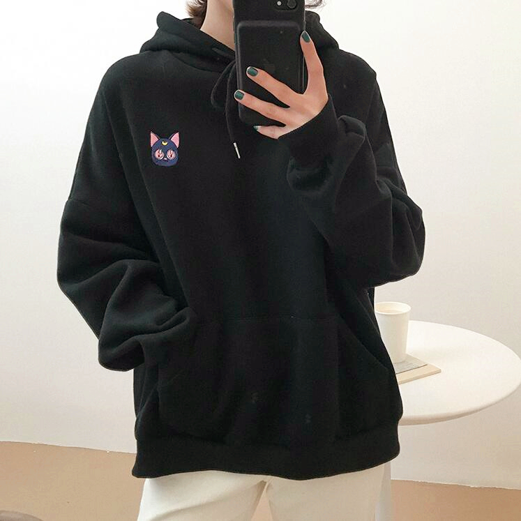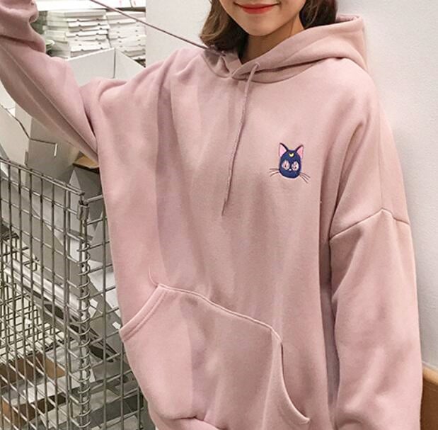 Pastel Pink Black Sailor Moon Luna Cat Embroidery Hoodies