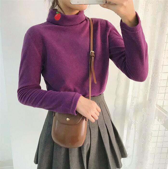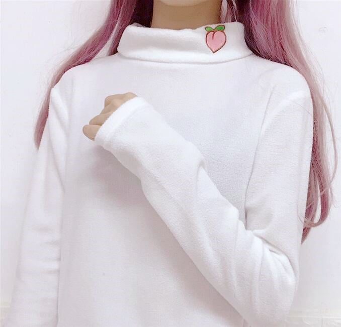 Peach Fruits Embroidery Turtleneck Fleece T-shirt