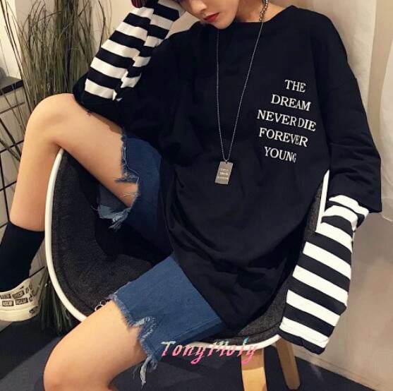 THE DREAM Printed Patchwork Striped Long Sleeve T-shirt