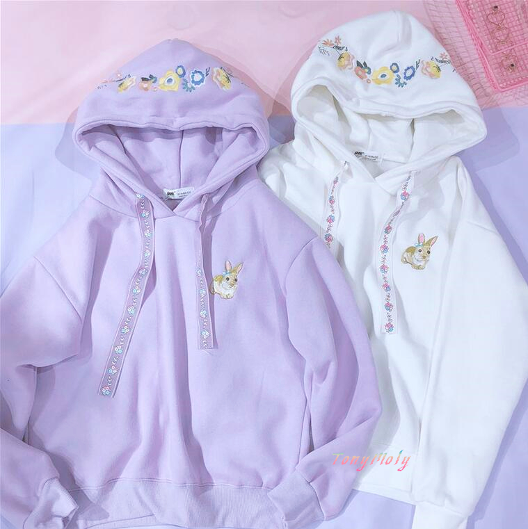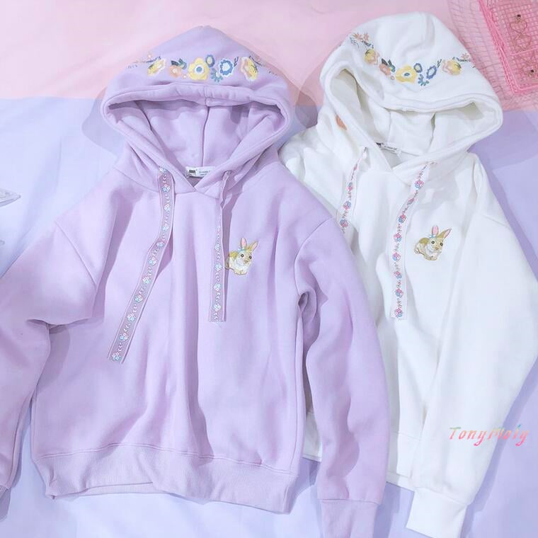 Bunny Rabbit Flower Embroidery Hoodie Sweatshirt
