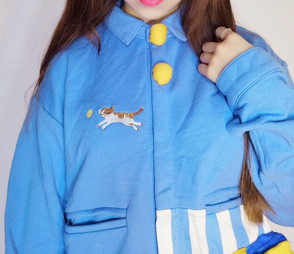 Cute Cat Embroidery Stripe Patchwork Color Block Coat