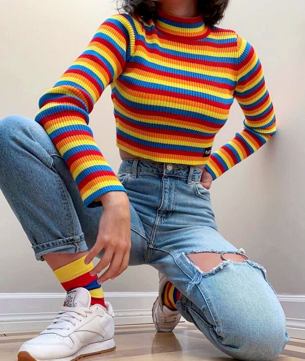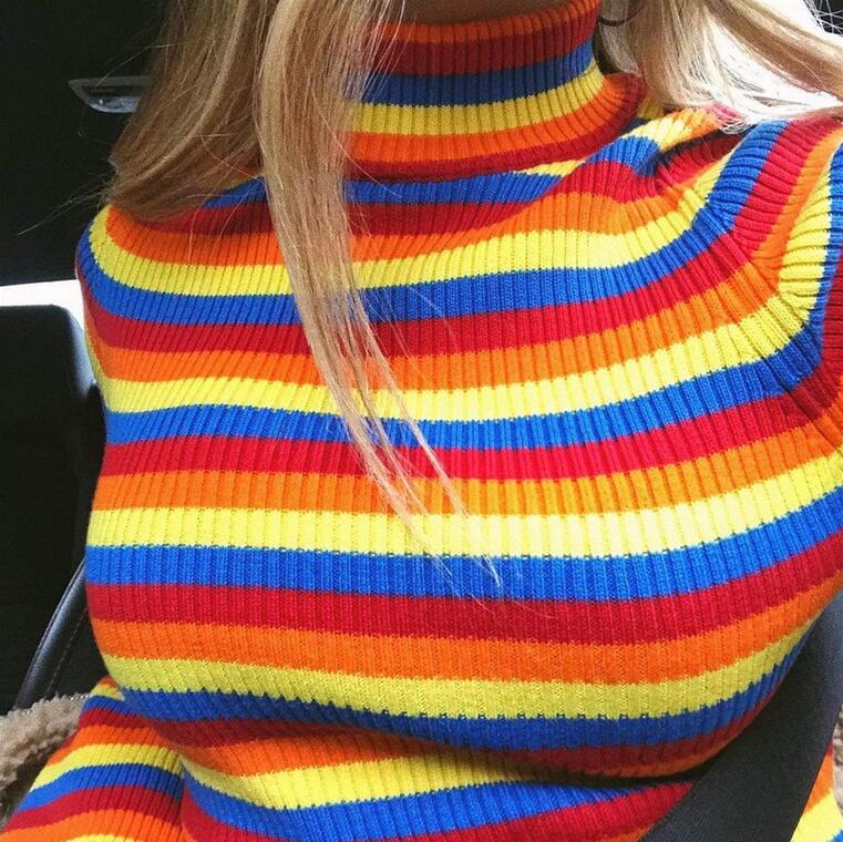 Rainbow Stripe High Collar Long Sleeve Knit Top