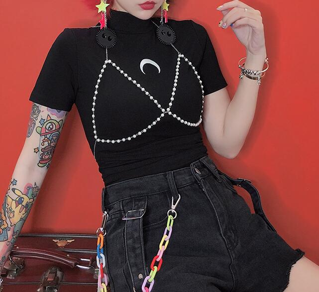✡ Just tee excluded chest chain. ✡Color: White, Black; ✡Size: One size Length-34.5cm, Bust-72cm, Shoulder-35cm, Sleeve-19cm; (2.54cm=1inch).