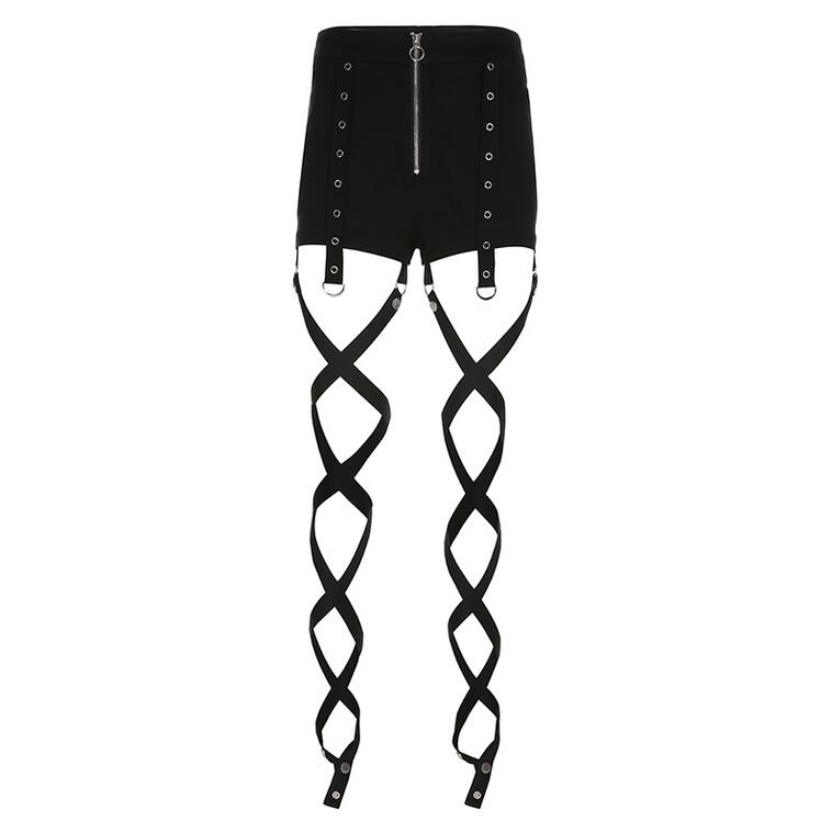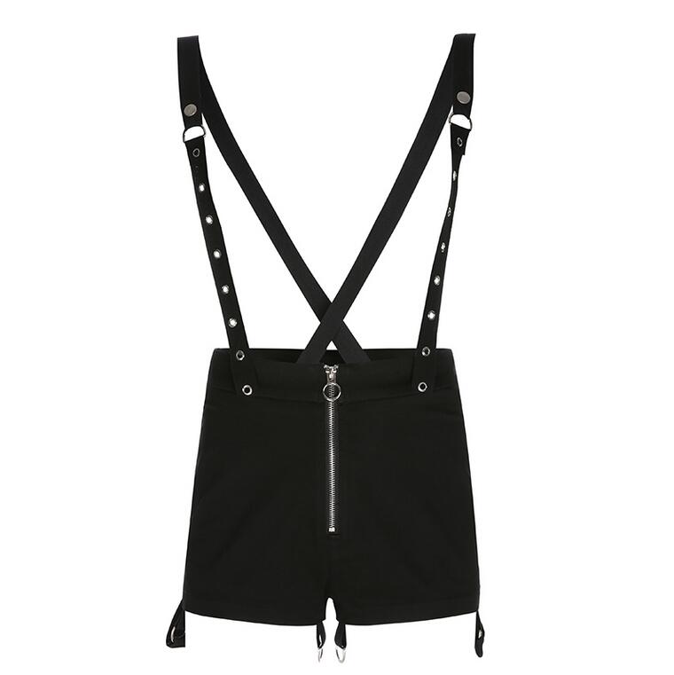 High Waist Black Strap Lace up Zip up Suspender Shorts