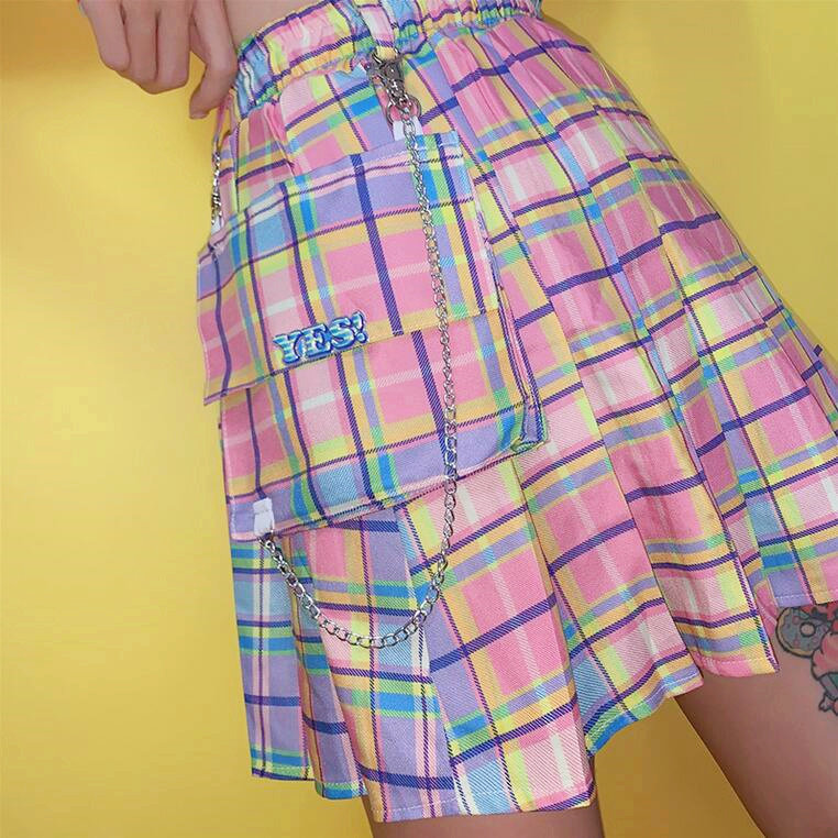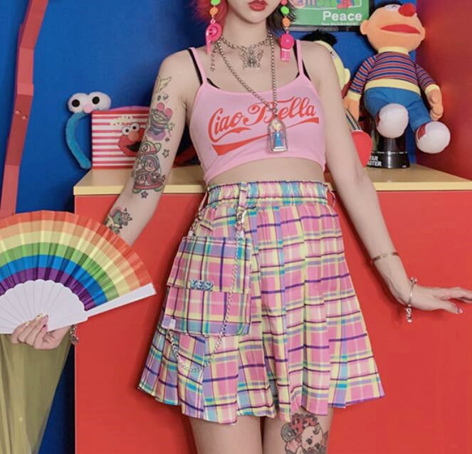 High Waist Color Block Colorful Plaid Pleated Skirt