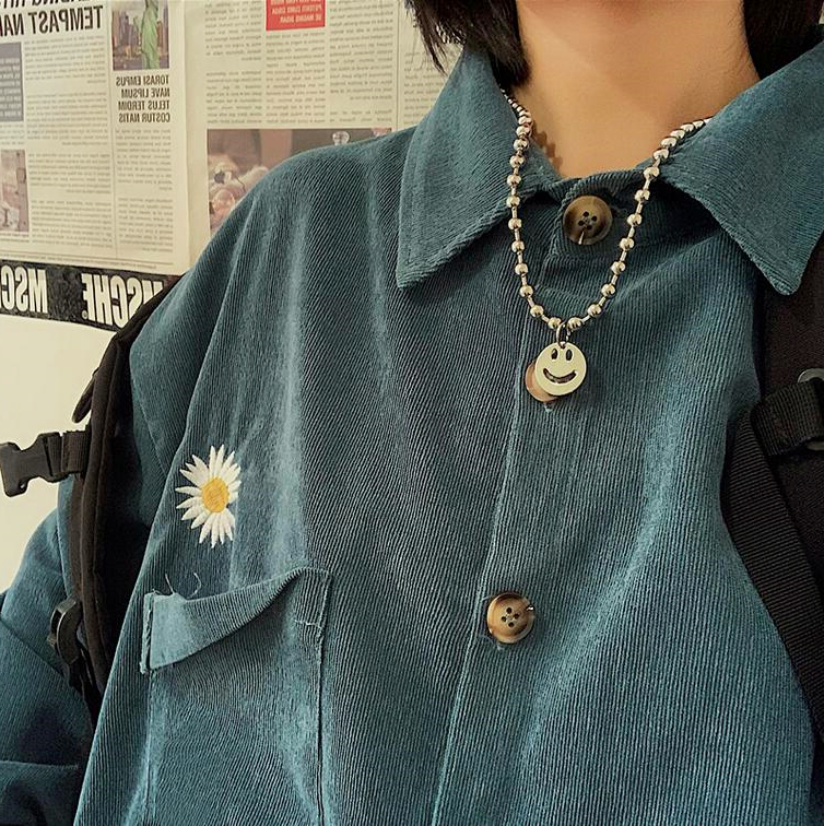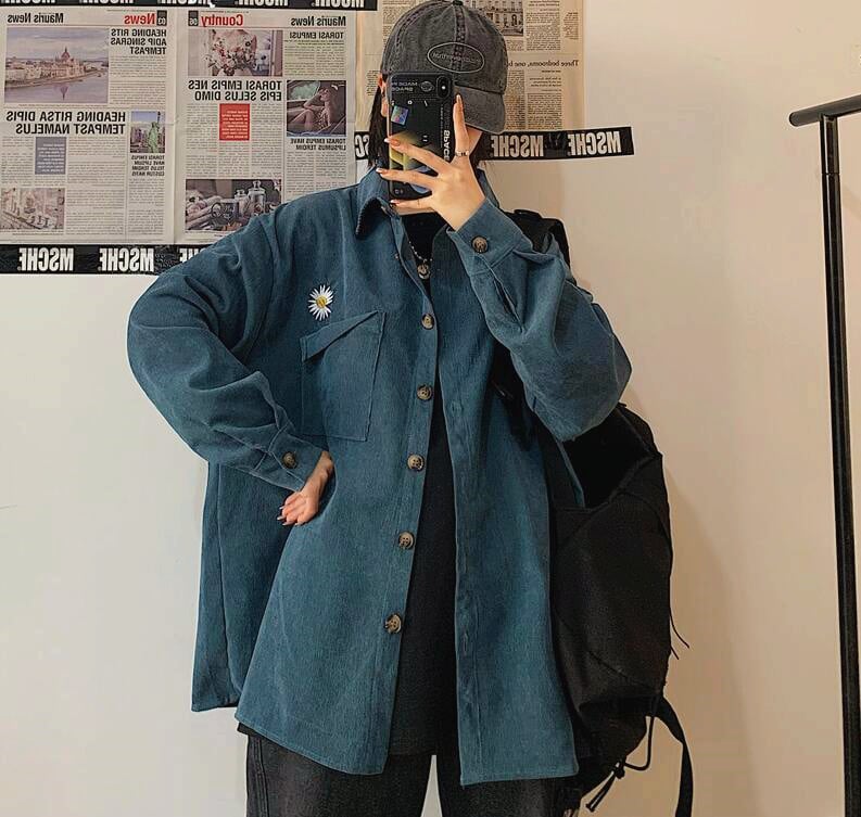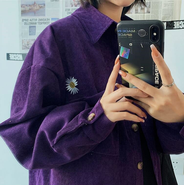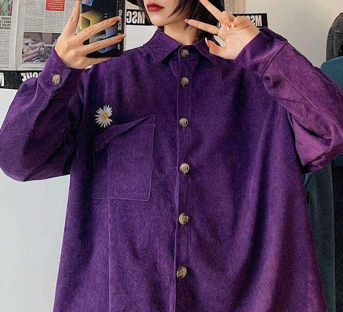 Daisy Flower Embroidery Corduroy Long Sleeve Shirt