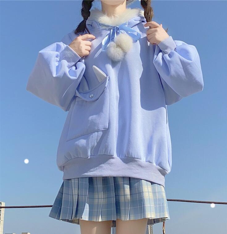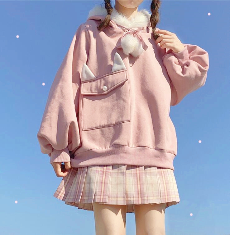 Cute Ear Pompon Pastel Color Hooded Sweatshirt