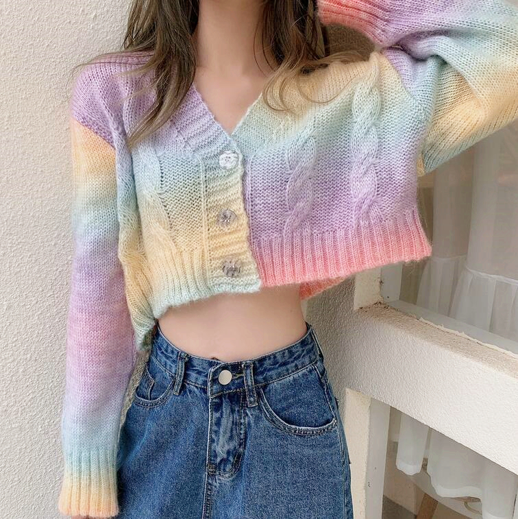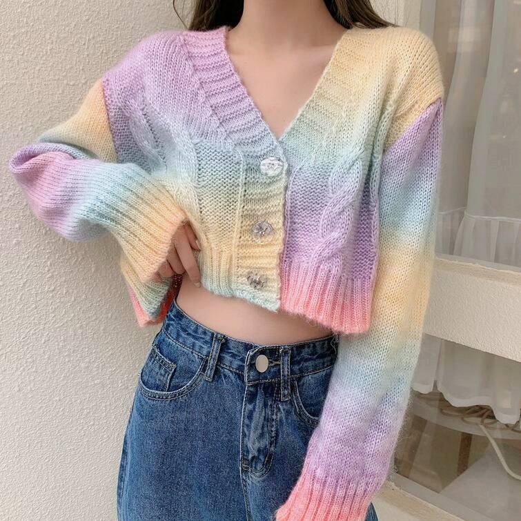 V-neck Tie-dye Color Block Gradient Sweater Knit Cardigan