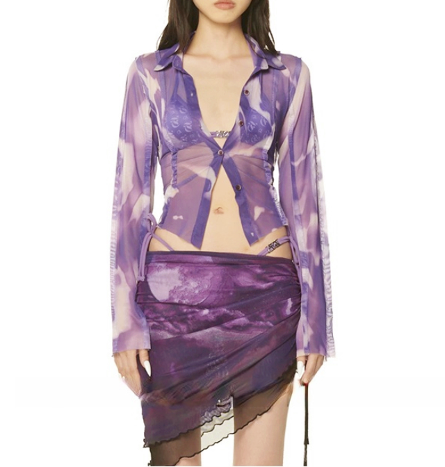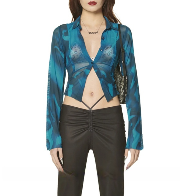 See-through Printed Mesh Blouse Shirt