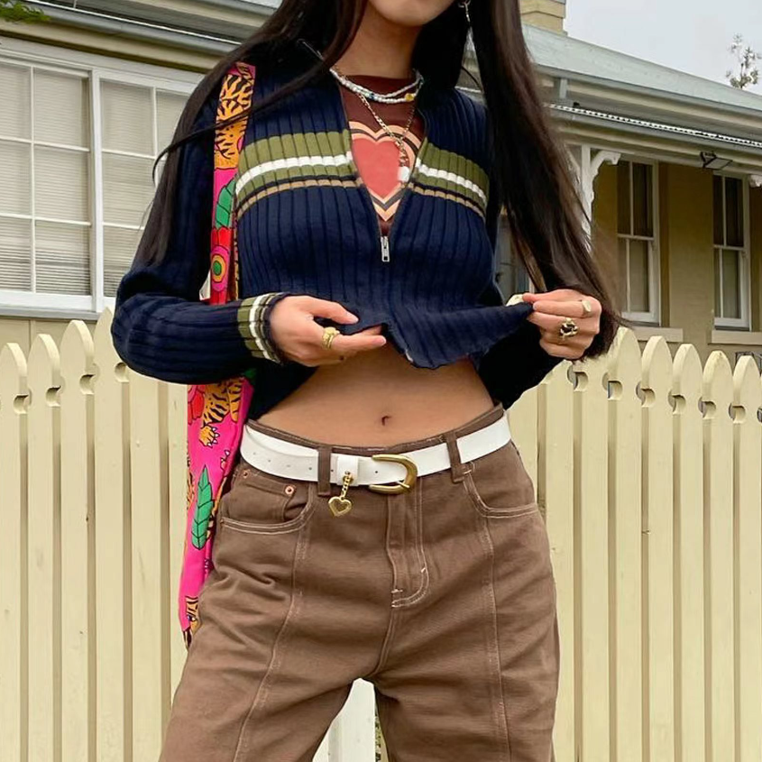 High Collar Stripe Color Block Zip up Knitted Jacket