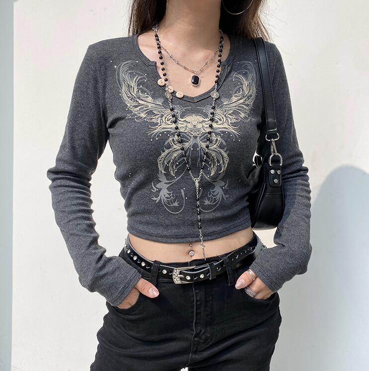 Crystal Rhinestone Butterfly Print Long Sleeve T-shirt