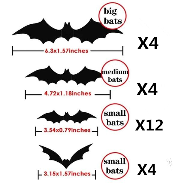 -✠Each pack totally includes: 24pcs pvc material bats,16cm x 4cm/each * 4 big bats ,12cm x 3cm/each * 4 medium bats, 9cm x 2cm/each * 12 small bats, 8cm x 4cm/each* 4 small bats.