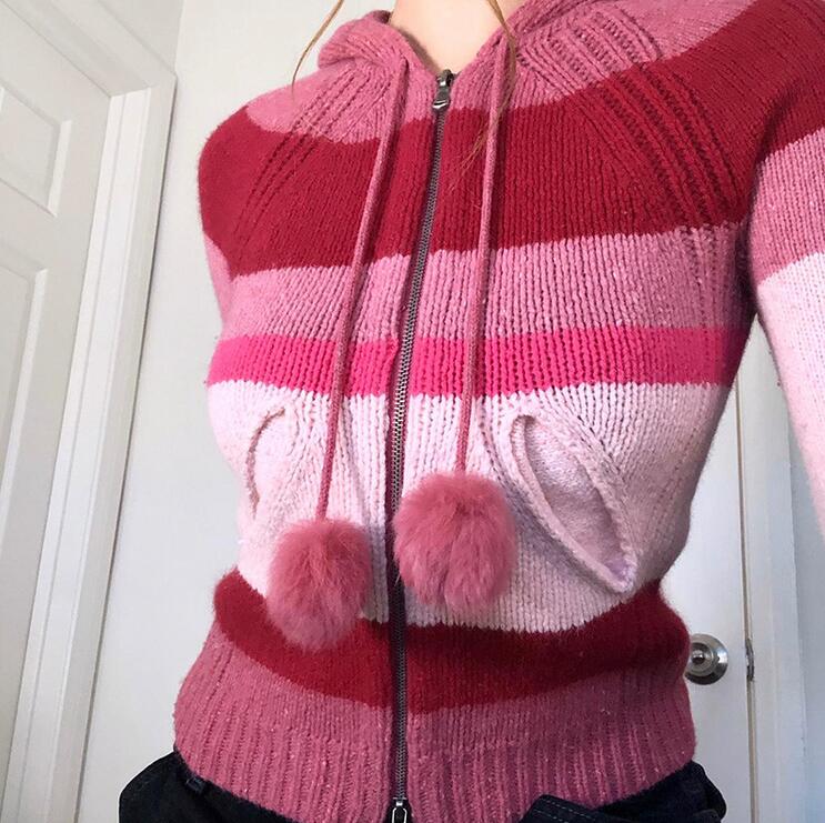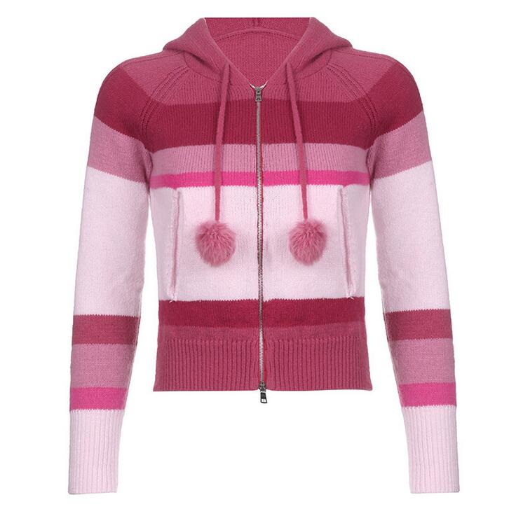 Pink Color Block Stripe Zip up Knitted Cardigan Hooded Coat with Fur Ball