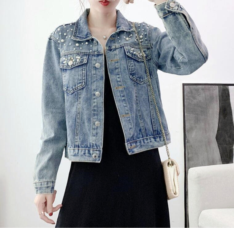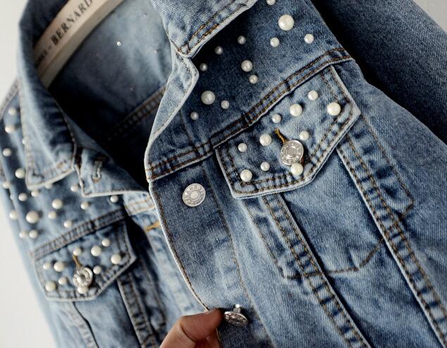 Women Pearls Beading Embroidered Denim Jacket Jean Coat