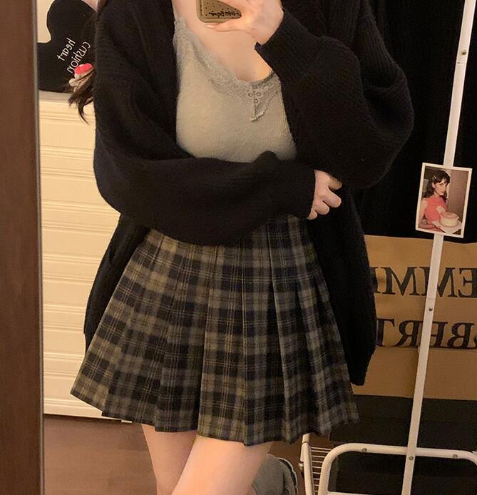 High Waist Color Block Checks Plaid Pleated Wool A-line Skirt