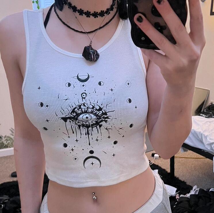 Punk Crescent Moon Star White Vest Crop Top