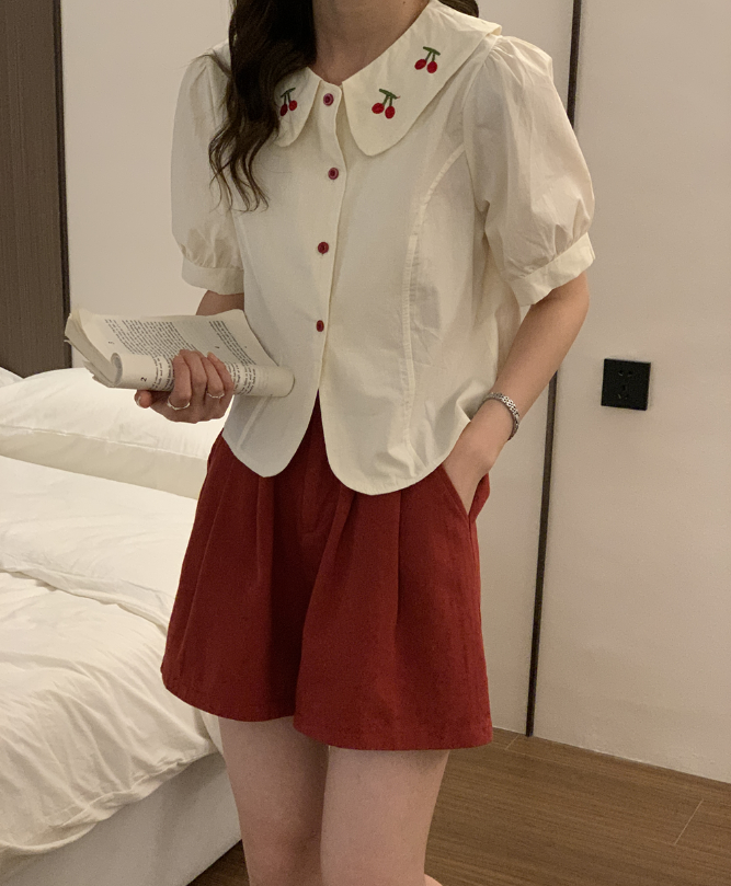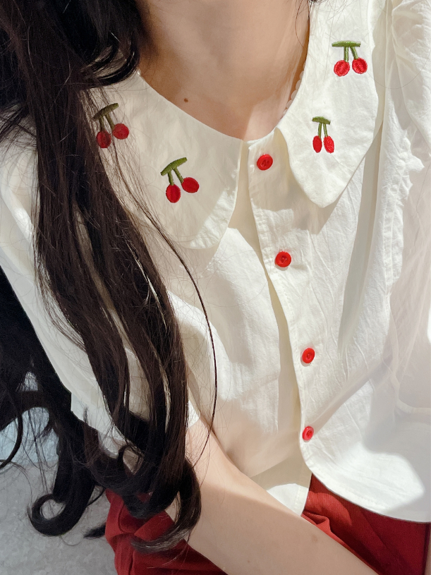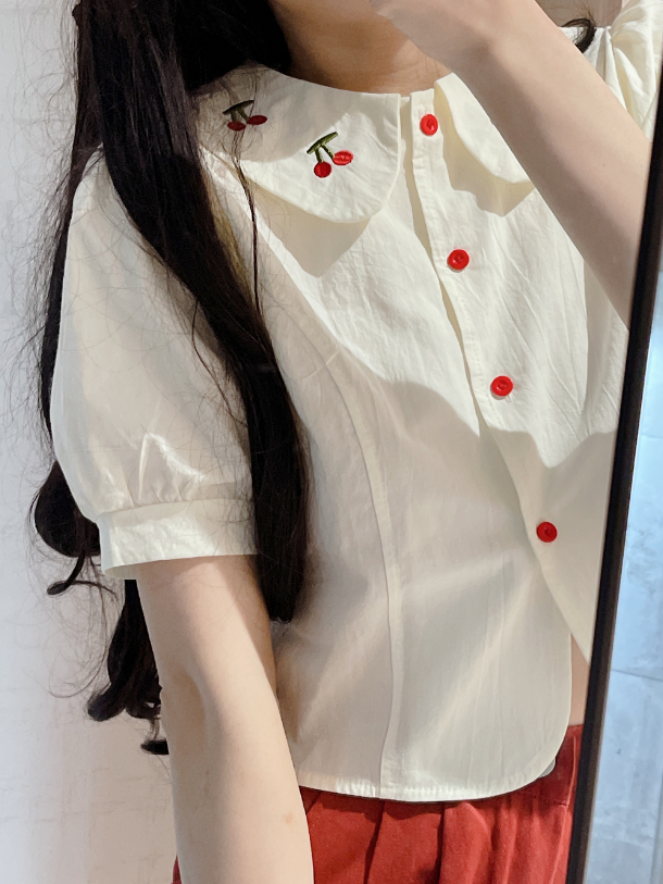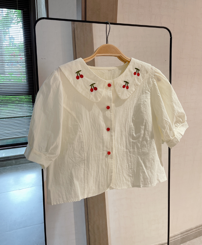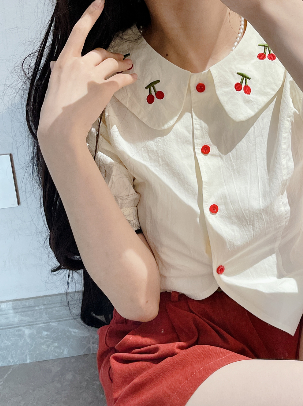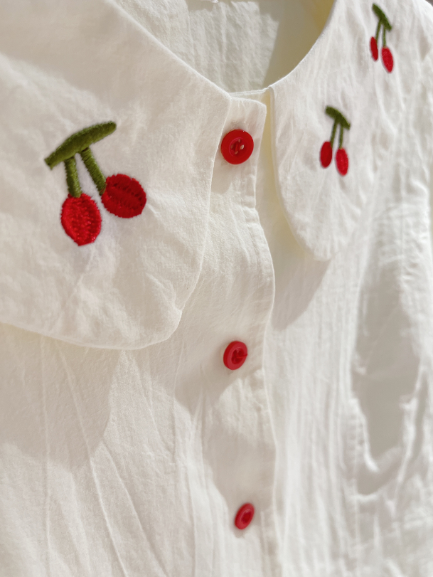 Vintage Cherry Embroidery White Cropped Shirt Blouse Top