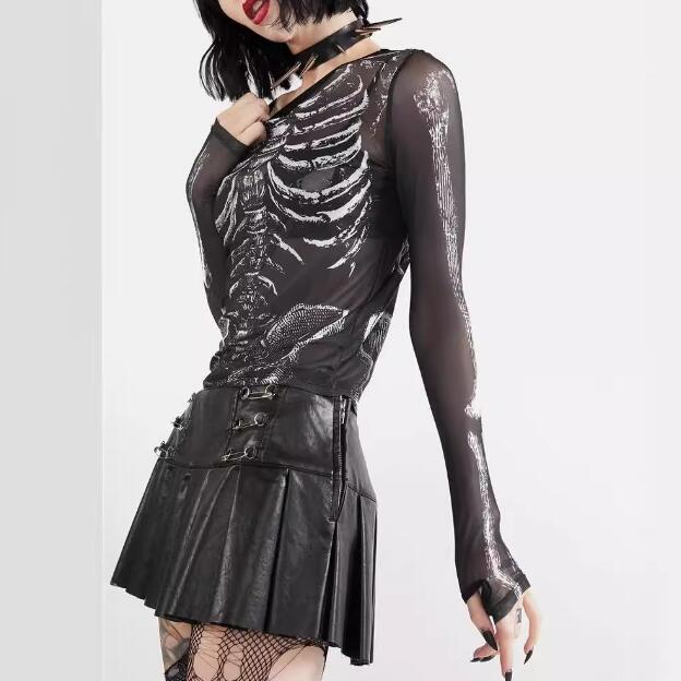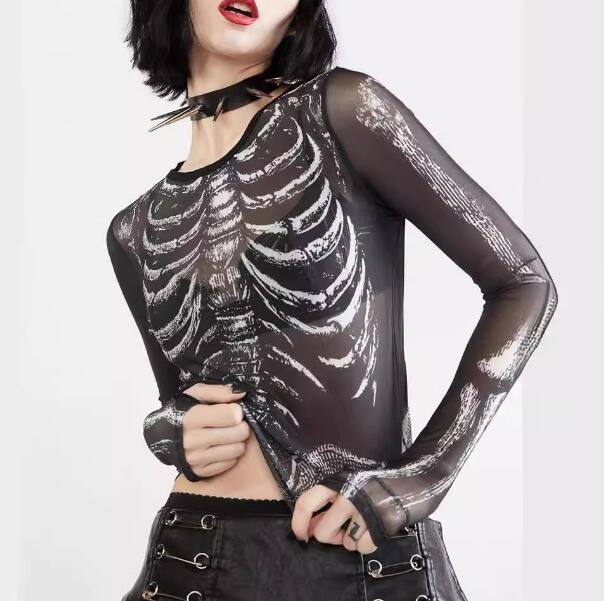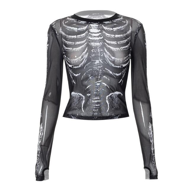 Skeleton Bone Print See Through Lace Mesh Long Sleeve Black Top