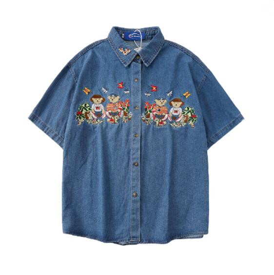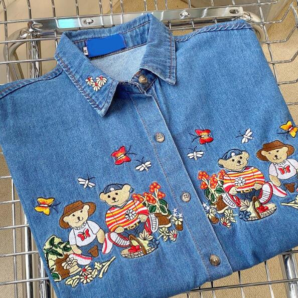 Bear Flower Embroidery Turndown Collar Denim Shirt