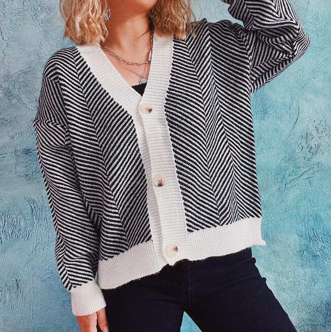 V-neck Stripe Button Knit Sweater Cardigan