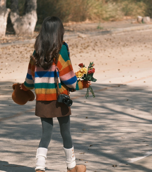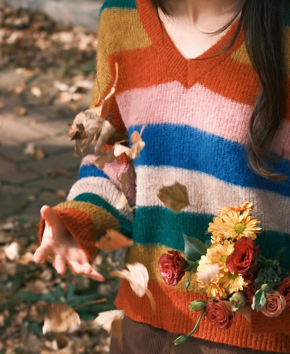 V-neck Rainbow Stripe Pullover Knit Sweater
