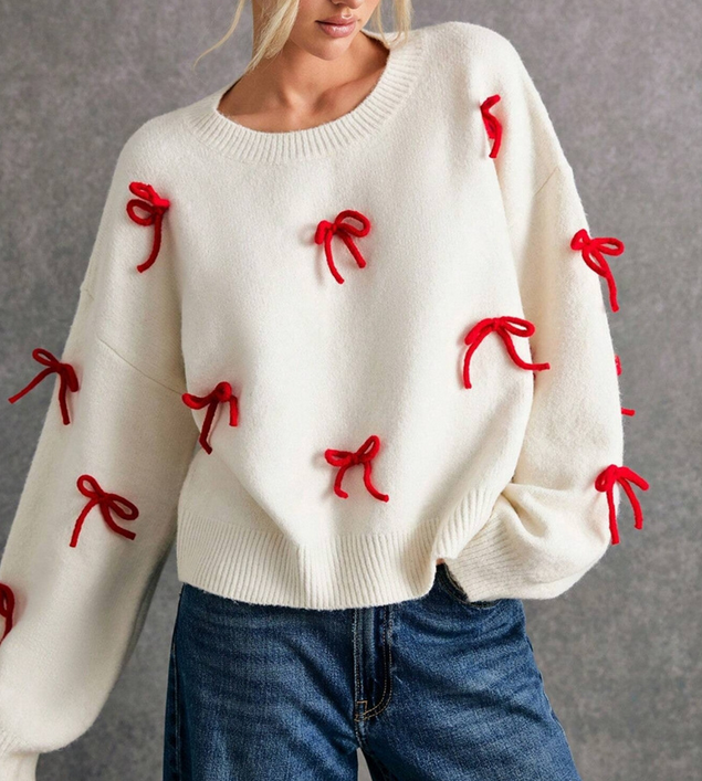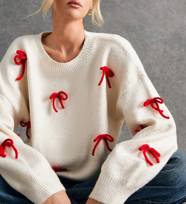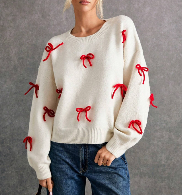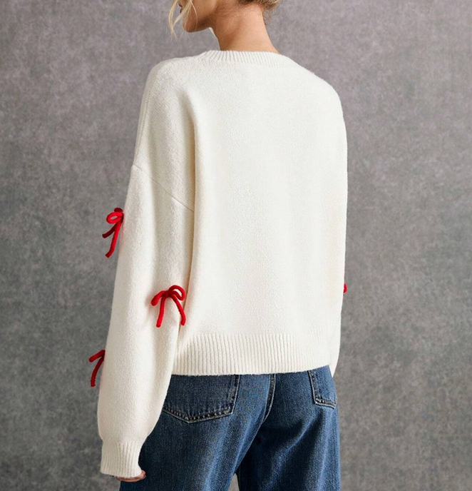 Red Bowknot White Pullover Knit Sweater